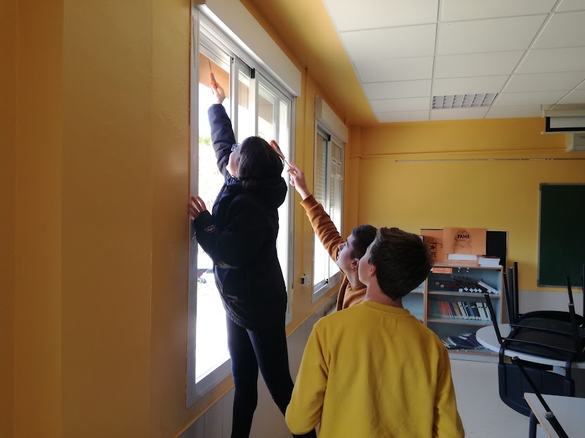 Hace varios años, colocamos unos soportes de nidificación por delante de las persianas para evitar la destrucción de nidos. Sin embargo, no dio resultado, pues ninguno de los tres soportes que colocamos fueron aceptados por los aviones. Este año (2020) hemos reubicado los soportes, colocando dos de ellos en sendas ventanas de la biblioteca, orientadas hacia el oeste. Además, previamente han sido pintados con una mezcla de pintura y arena, para facilitar que el barro empleado por los aviones en la construcción de sus nidos tenga un mayor agarre. ¡Esperemos que funcione!